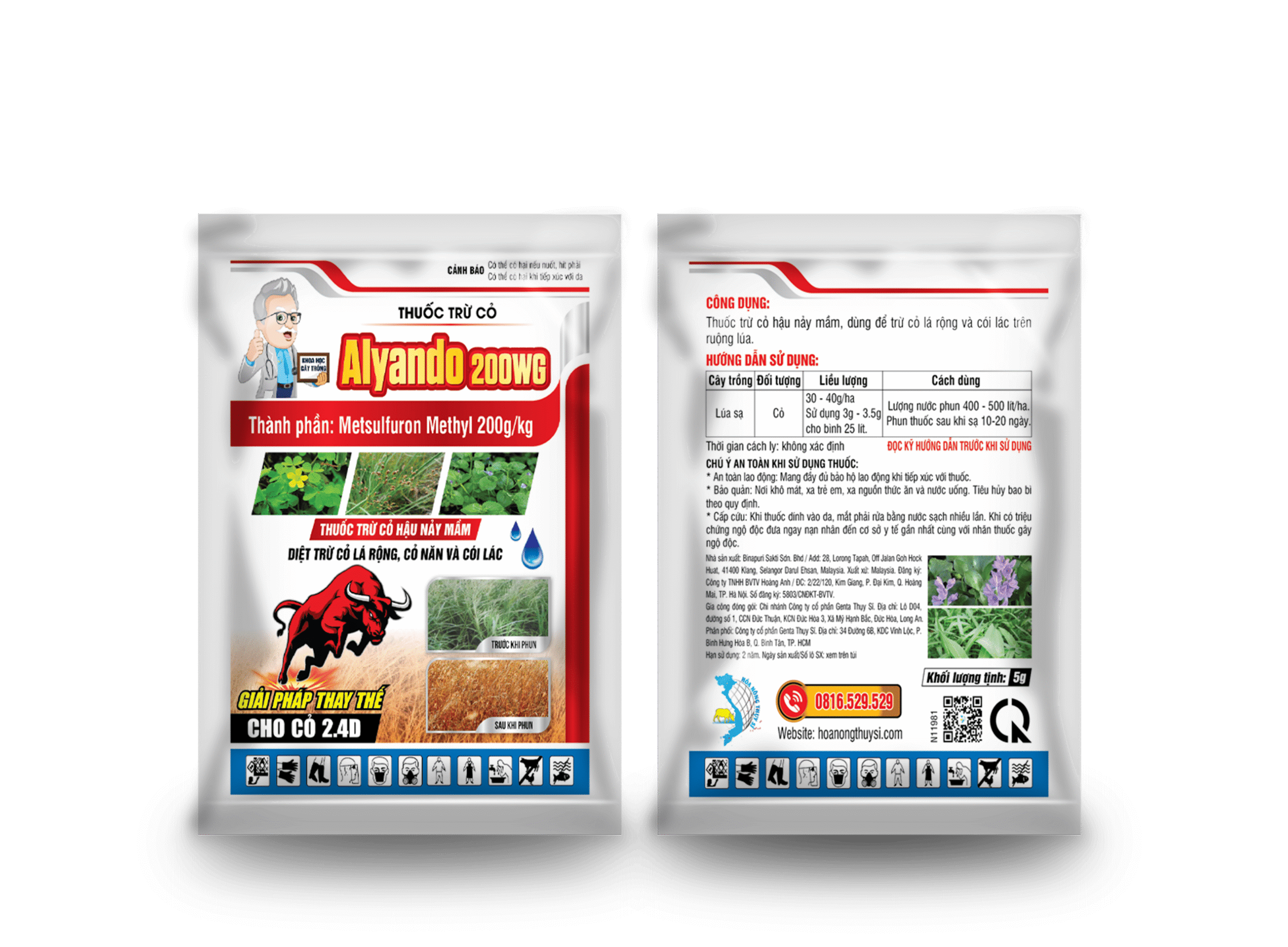 ALYANDO 200WG là thuốc trừ cỏ hậu nảy mầm, chuyên dùng để tiêu diệt các loại cỏ lá rộng, cỏ năn và cói lác trên ruộng lúa. Sản phẩm có tính lưu dẫn, tác động cả qua lá và rễ, giúp xử lý cỏ hiệu quả trong điều kiện ruộng đã mọc cỏ.
