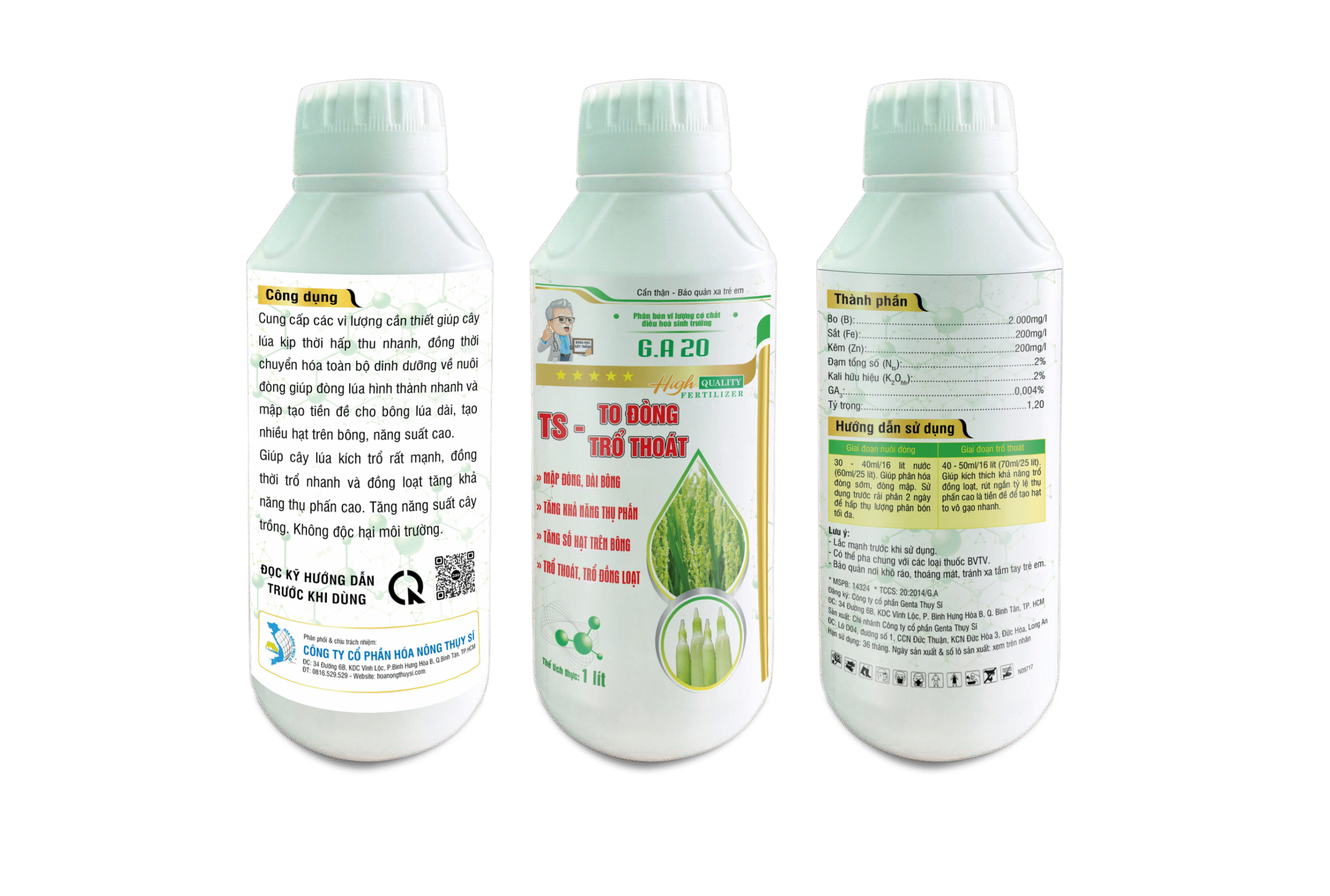 Phân bón vi lượng GA20 – TS TO ĐỒNG TRỔ THOÁT là giải pháp dinh dưỡng chuyên sâu cho giai đoạn làm đòng và trổ của cây lúa. Sản phẩm cung cấp hệ vi lượng thiết yếu như Bo, Sắt, Kẽm kết hợp cùng đạm – kali và GA₃, giúp cây hấp thu nhanh, thúc đẩy quá trình hình thành đòng mạnh mẽ và đồng nhất.